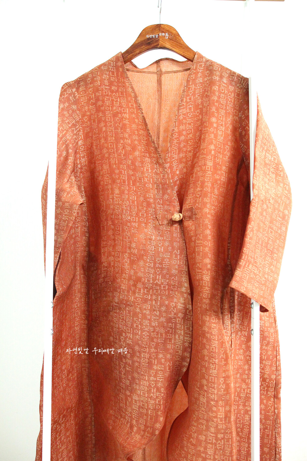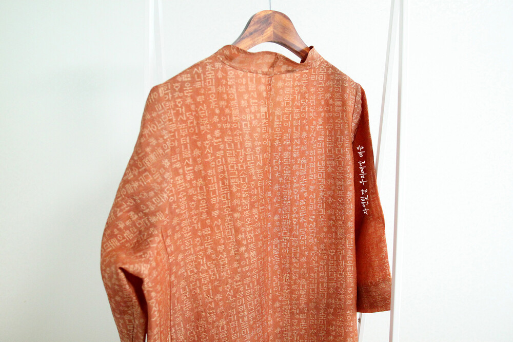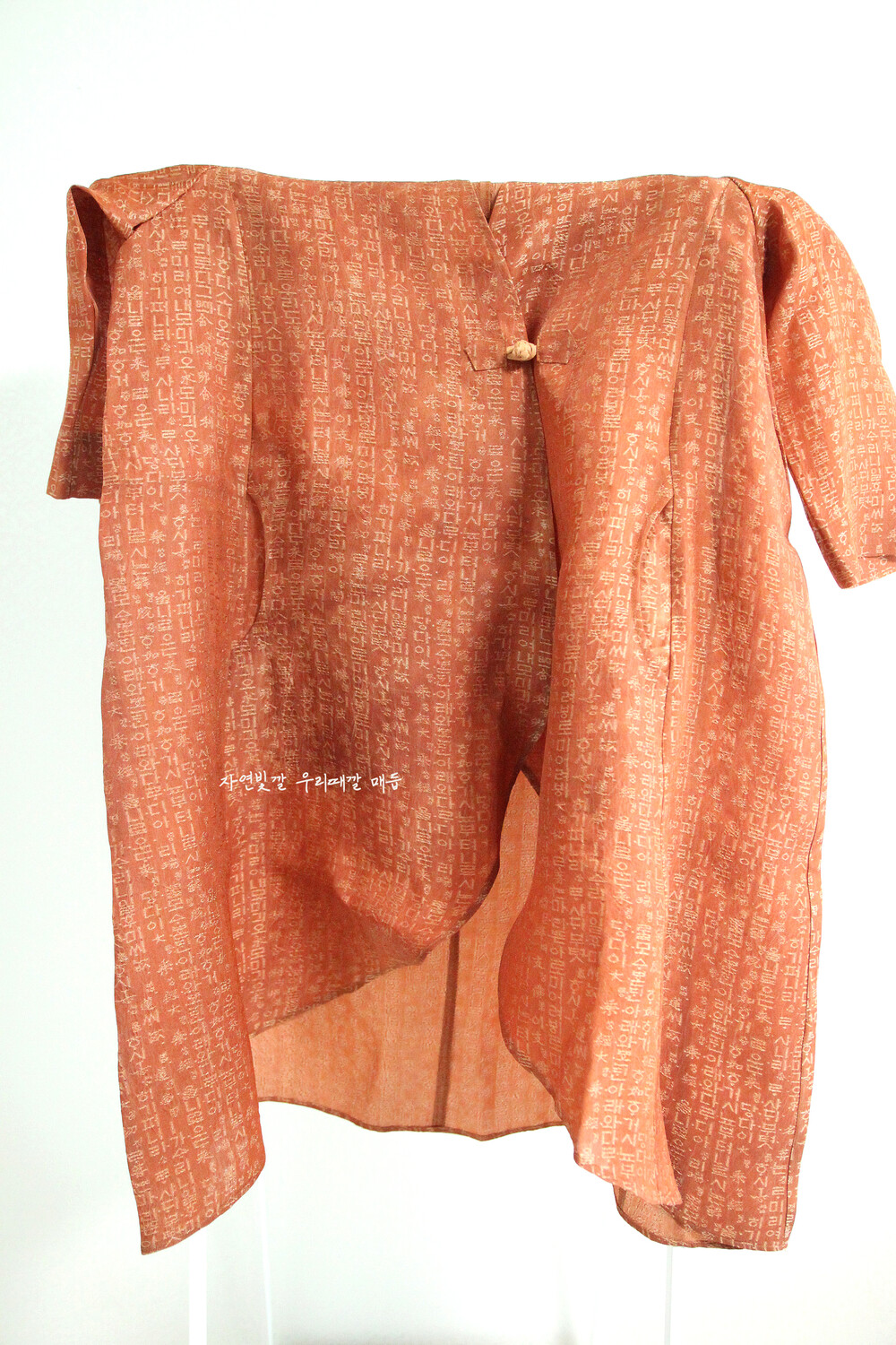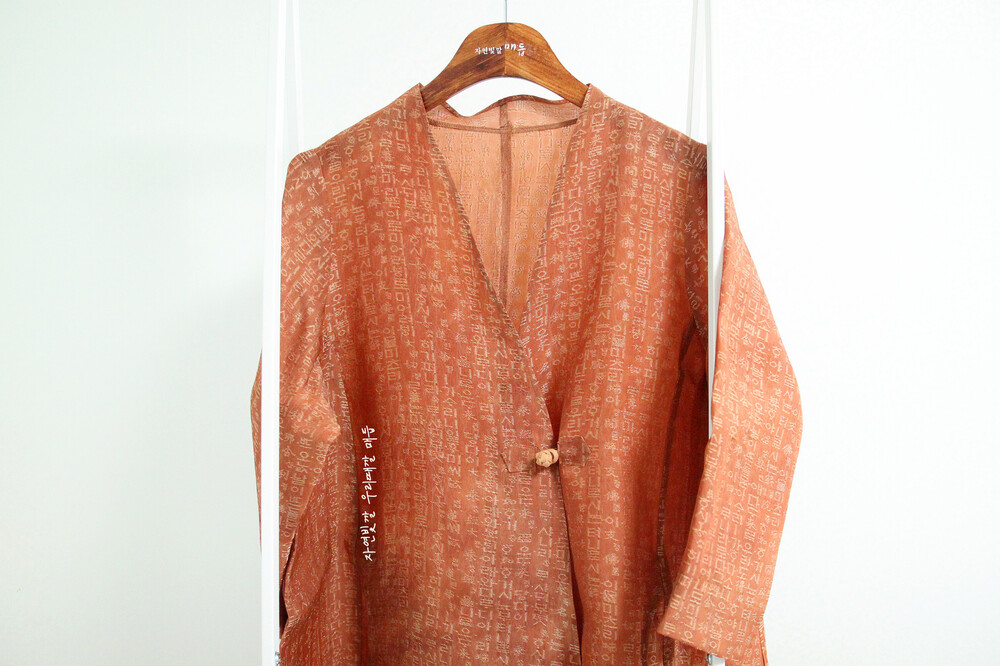 한글이 새겨진 멋진 천연염색 자켓입니다.