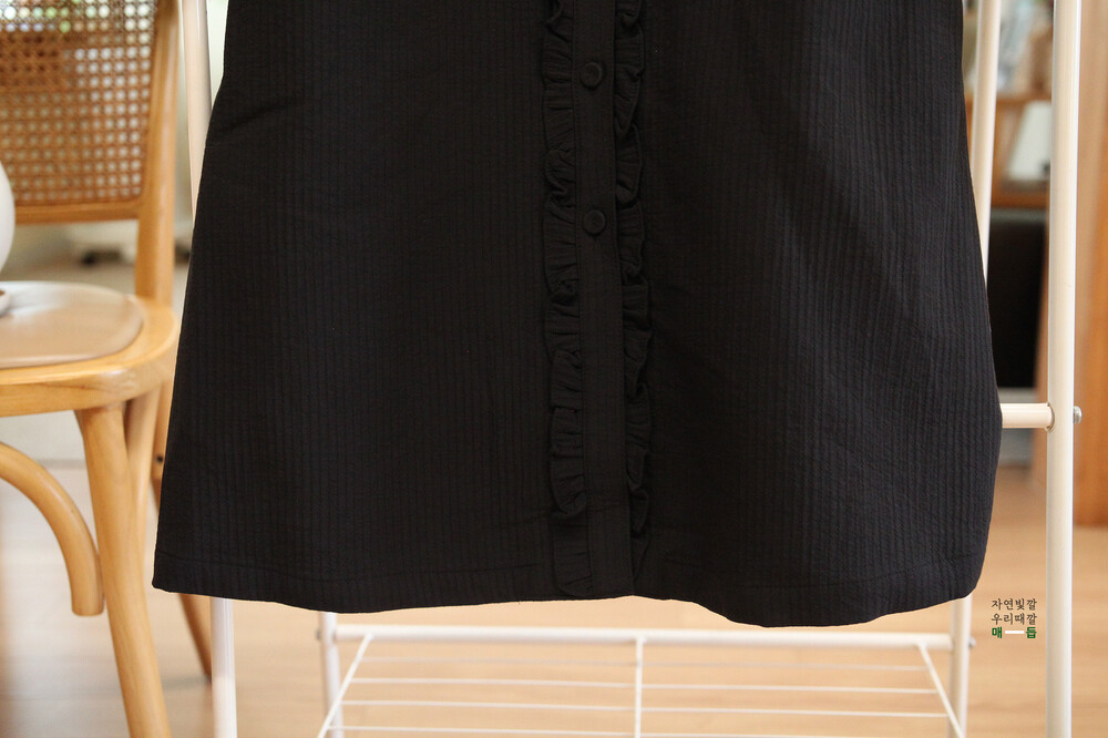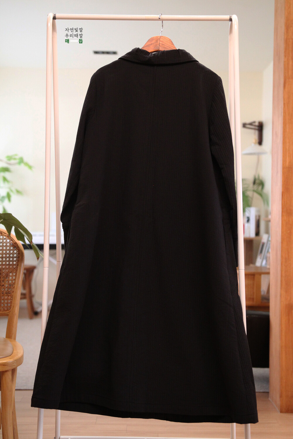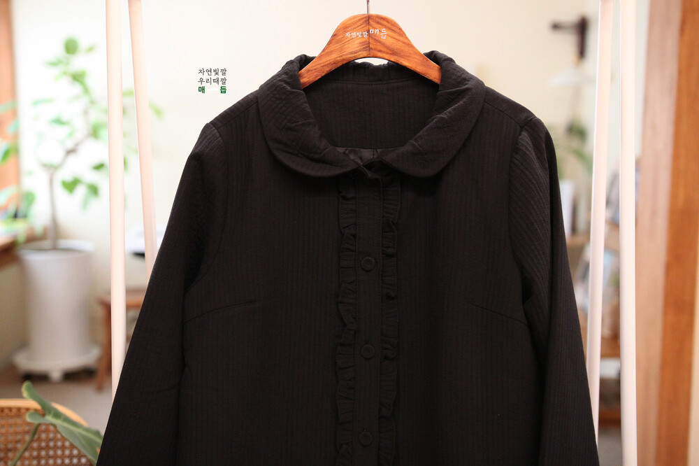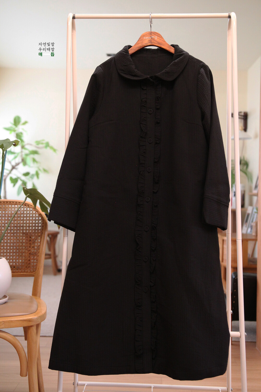세로로 이어진 앞 프릴이 인상적인 외투입니다 :)